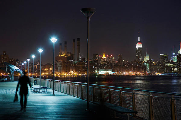 A man walks down a pier in New York Monday night across from the Empire State Building, lit in white and red as part of a coordinated attempt by several landmark buildings around the world to raise awareness of the disaster in Japan. Lucas Jackson/Reuters
