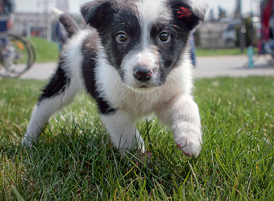 Panda, a rescued stray puppy, strolls on the grass during a protest in Bucharest, Romania, against euthanasia of stray dogs and new regulations to be voted by parliament regarding ways to deal with the stray dog issue. According to protesters gathered outside Romania’s parliament, if voted in, the new law would allow the local administration to put down stray dogs. According to local media, there are 50,000 stray dogs in the Romanian capital of which 60 percent are sterilized.
