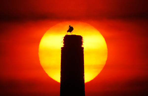 A male stork prepares a nest on the chimney of an old distillery at sunrise in Nauen-Ribbeck near Berlin, Germany. The male storks arrive a few days earlier than their partners to prepare the nest for raising their chicks in the marsh area that is rich in food for them.