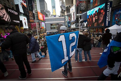 A Seattle Seahawks fan wears a “12th Man” flag on “Super Bowl Boulevard” at Times Square, as part of the Super Bowl lead up, in New York. Andrew Kelly/Reuters