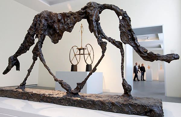 The sculpture ‘The Dog’ from 1951 is pictured in front of the sculpture ‘The Chariot’ from 1950 during a media preview of an exhibition of late Swiss artist Alberto Giacometti (1901-1966) at the Kunsthaus Zurich art museum in Zurich, Switzerland. The exhibition, ‘Alberto Giacometti – The Art of Seeing,’ which shows some ninety works of the Swiss sculptor, painter and graphic artist, runs from March 11 until May 22, 2011. Arnd Wiegmann/Reuters