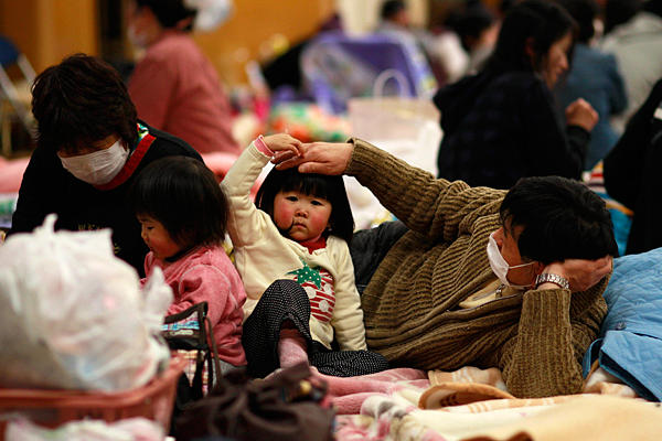 A family rests in a shelter in the city of Soma, Fukushima Prefecture, Japan, three days after a massive earthquake and tsunami struck the country’s northeast coast. On top of the losses of family, friends, and property, evacuees in the area are now faced with the fears of radiation contamination from nearby damaged nuclear facilities. Wally Santana/AP