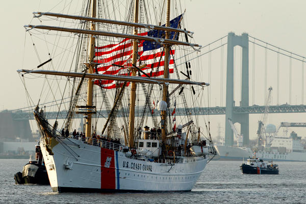 The US Coast Guard Barque Eagle makes its way up Delaware River, in view of the Walt Whitman Bridge in Philadelphia on the first stop of a world tour to celebrate its 75th anniversary. Scheduled tour stops will include London, Reykjavik, Iceland, and Hamburg, Germany, where the ship was built in 1936. It was later acquired by the US through war reparations. AP