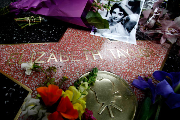 Flowers and a portrait adorn Elizabeth Taylor’s star on the Hollywood Walk of Fame in Los Angeles. Taylor died early Wednesday. Reed Saxon/AP