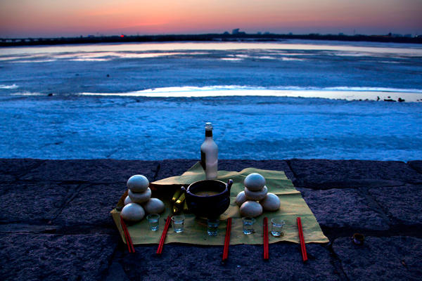 An religious offering of food and alcoholic drinks placed on a mat with chopsticks and glasses sits on the bank of the partially frozen Songhua River in the northern city of Harbin, Heilongjiang province. David Gray/Reuters