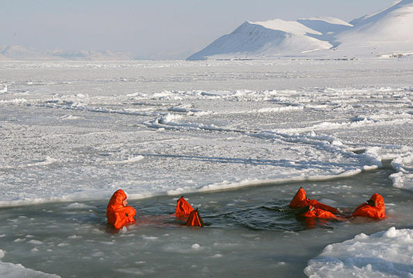 Britain’s Prince Harry (l.) tries out an immersion suit, during training for the Walking with the Wounded expedition, on the island of Spitsbergen, situated between the Norwegian mainland and the North Pole. The third in line to the British throne will train for three days before accompanying the team on the first five days of their four-week expedition.